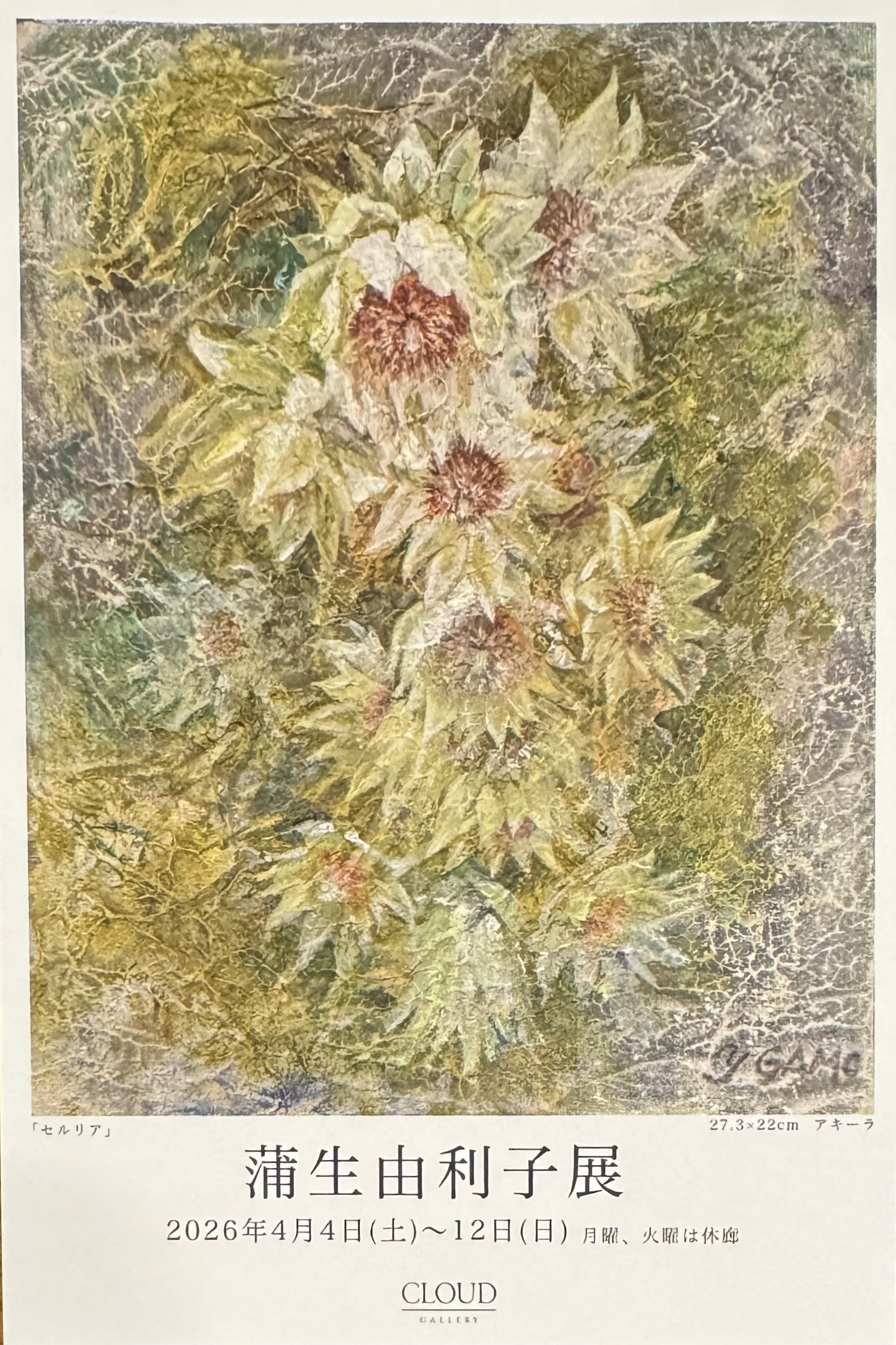 紙にファイバーペーストで地塗りをし、ボコボコ感を生かしたアキーラの厚塗りと水彩のミックスの作品を多数展示しております。